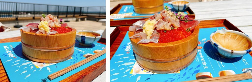 あじ、いくら、まぐろ、なめろうの3種桶丼 2,280円をいただきました。