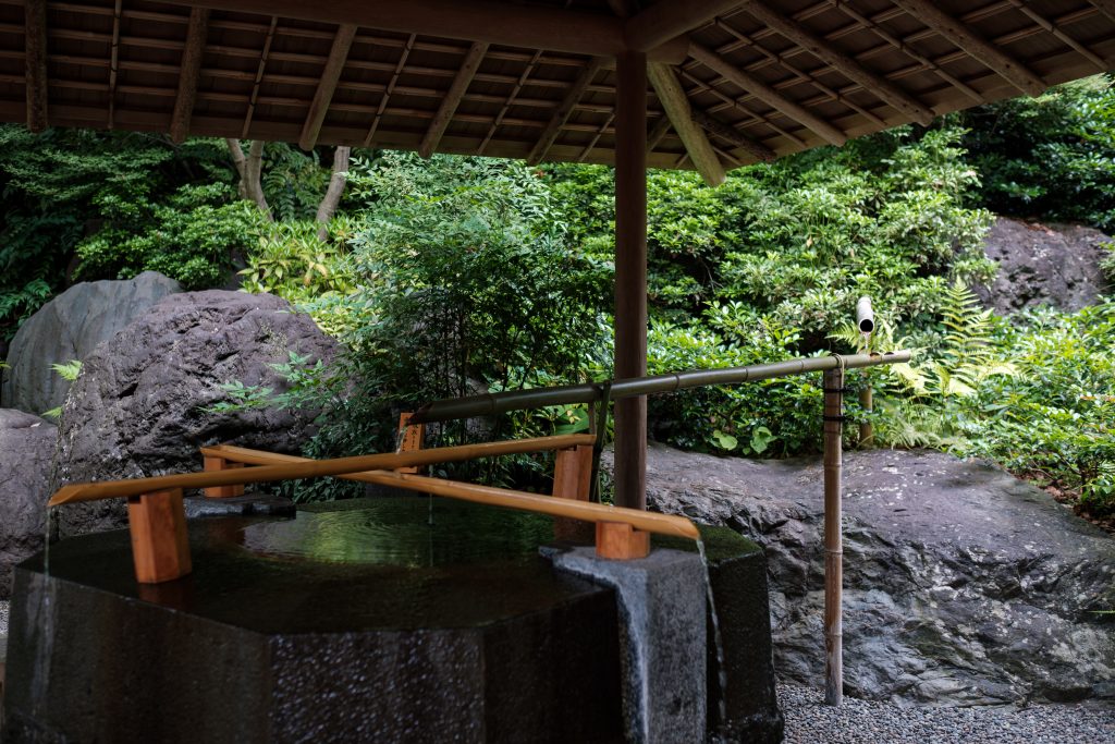 この手水舎の左横に難波の小池があり本殿の真裏にあたる。